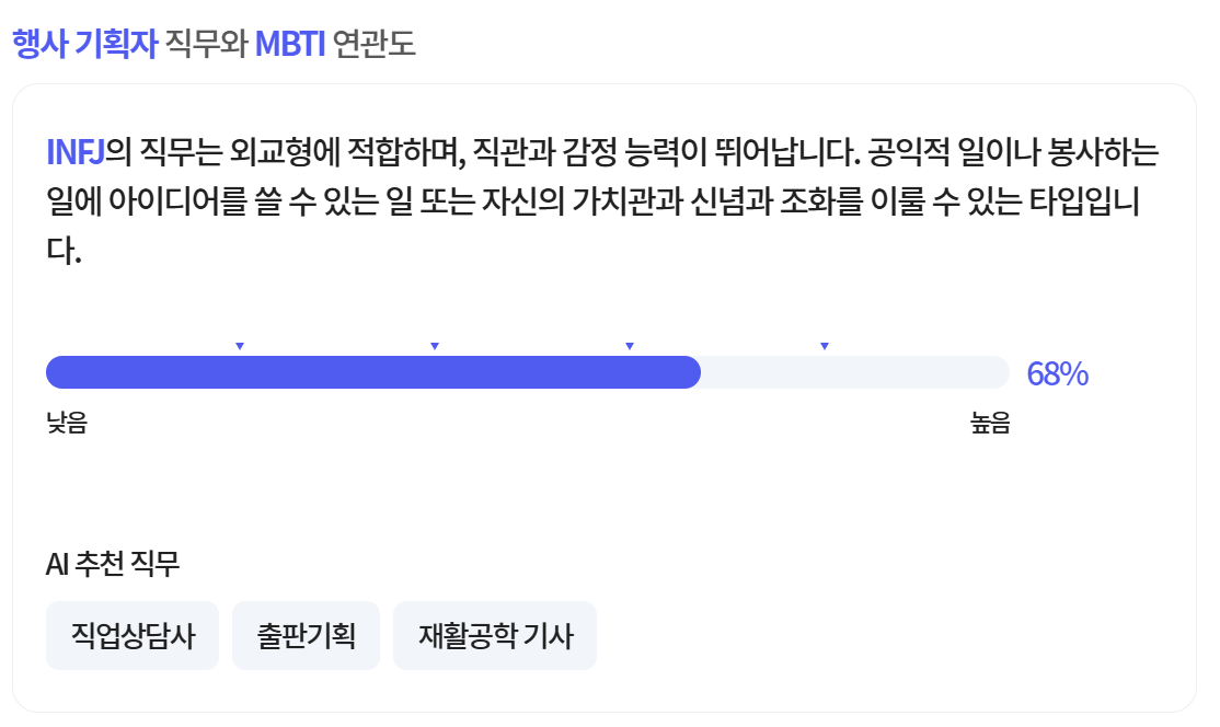 | MBTI 성향과 직무 특성을 연계하여 적합한 추천 직무 제안 |