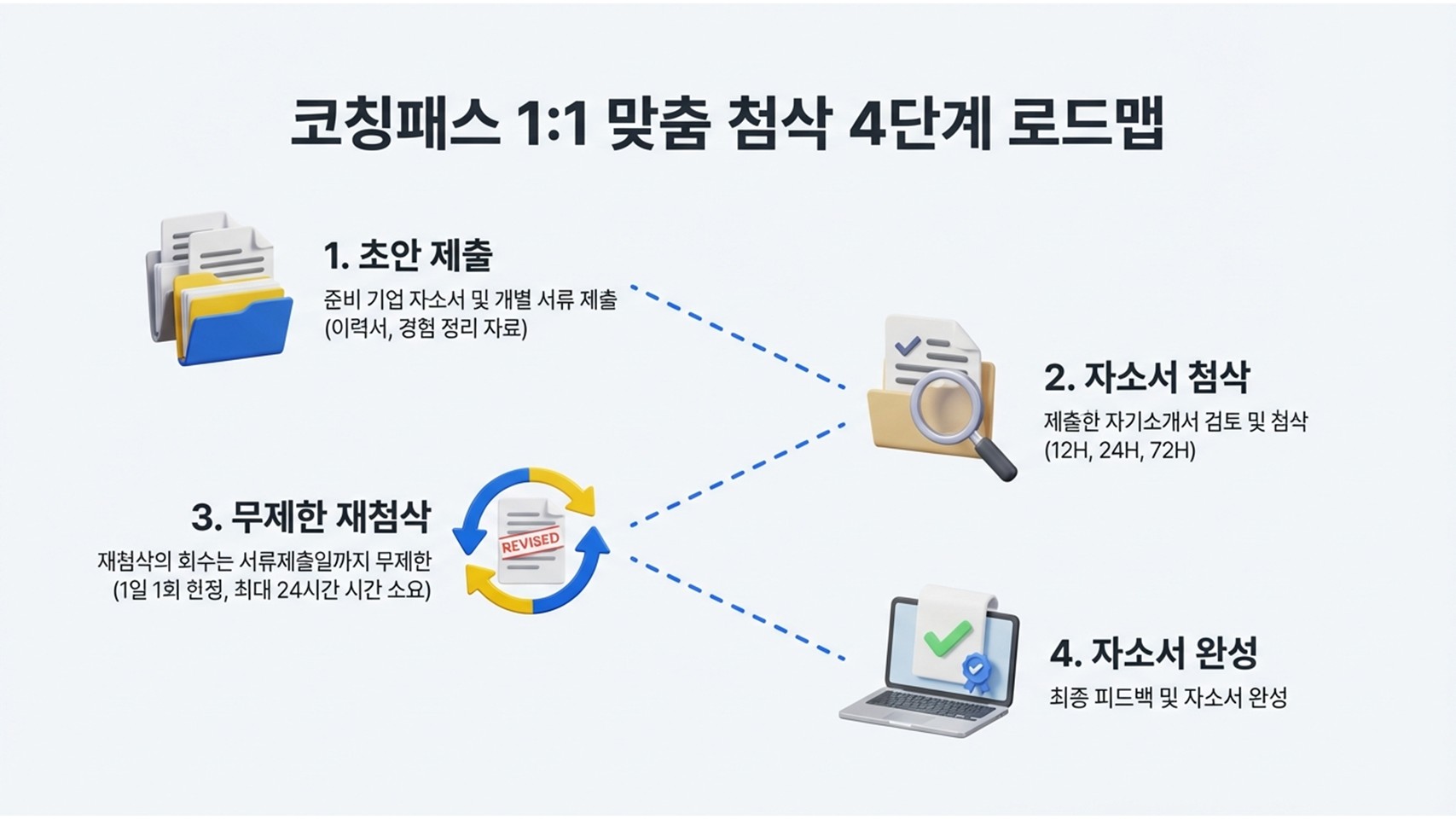 서류 맞춤 첨삭은 서류를 메일로 보낸 이후에는 첨삭 작업이 바로 들어가므로 환불이 불가합니다. 서류를 보내기 전에만 환불이 가능합니다.