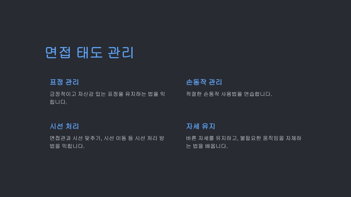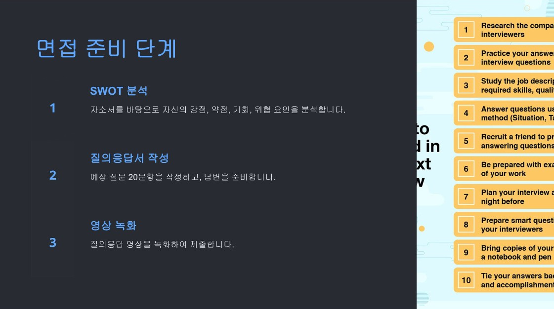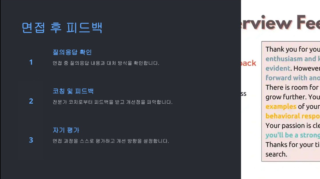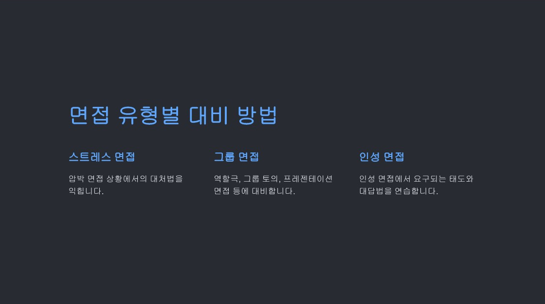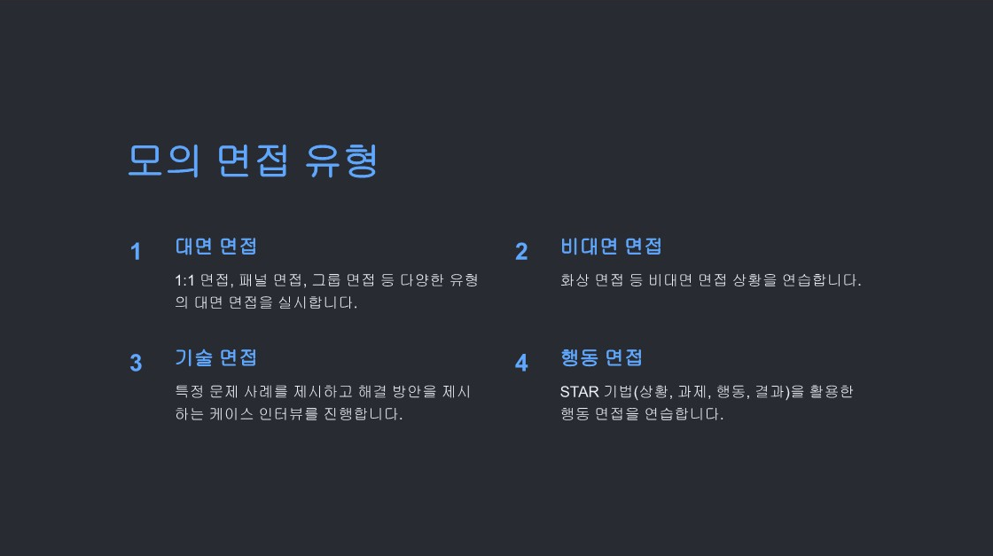 면접 코칭으로서 학생들의 성장을 지원하고, 그들이 원하는 목표를 이룰 수 있도록 최선을 다하겠습니다. |